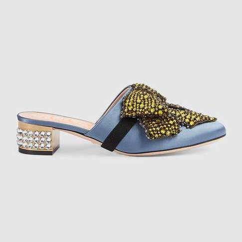 Nella moda inverno 2017 scarpe, la linea di scarpe basse Gucci torna con alcune delle forme diventate iconiche per la maison, a cominciare dalle slippers con inserto in pelliccia, proposte in agnello o in pelle con borchie, cui fanno da contraltare originali ciabatte colorate in lana merinos e sabot gioiello con tacco di un paio di cm.