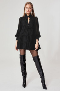 Con un vestito appena sopra il ginocchio di chiffon a pieghe. In un colore a contrasto con gli stivali rossi.