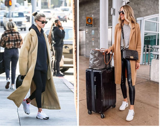Per lo più neri, ultimamente lucidi. Anche sotto gonne e abiti. Rigorosamente con coprispalla ampi e lunghi e sneaker - caviglia al vento.